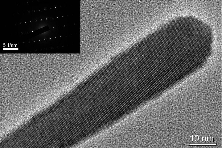 To this end, the initial work on this project involved fabricating uniform arrays of ZnO nanowires following on previously published methods,2 based off of the vapor-liquid-solid (VLS) technique. We characterized the effects of the various chemical vapor deposition experimental parameters, including gas flow, O2 partial pressure, Zn source powder mass, and total gas flow rate, optimizing for uniform and aligned ZnO nanowires. The nanowires were characterized using high-resolution transmission electron microscopy (HRTEM) (see photo above) and X-ray diffraction (XRD) to determine crystallinity and nanowire quality.